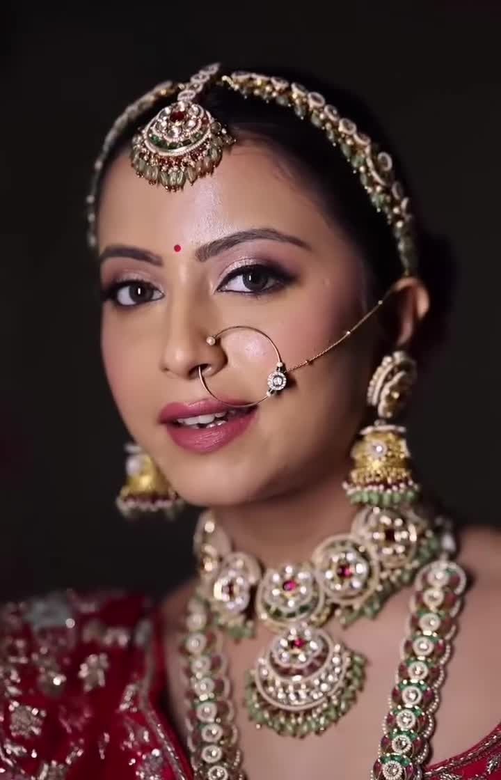 A beautiful portrait showcasing the complete bridal jewellery set against a rich pink lehenga, all available for rent.