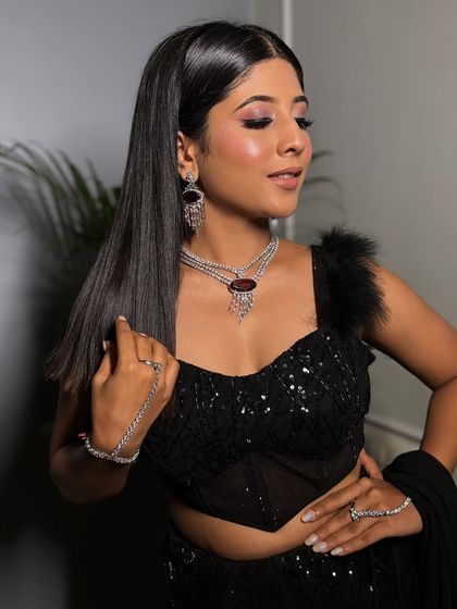 Own the night with my collection of glamorous rental outfits perfect for sangeet, cocktail parties, or receptions. I offer stunning lehengas and gowns in bold colors like black and red, featuring heavy sequins, feather details, and modern cuts designed to make you the star of the evening.
