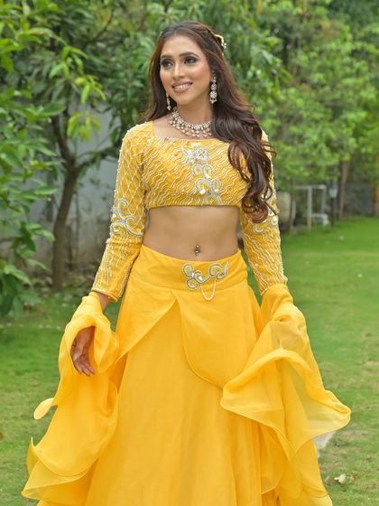 Make your pre-wedding functions unforgettable with my collection of bright and cheerful outfits. I offer rental lehengas in vibrant yellows, greens, and floral prints that are light, fun, and perfect for the lively atmosphere of Haldi and Mehendi ceremonies.