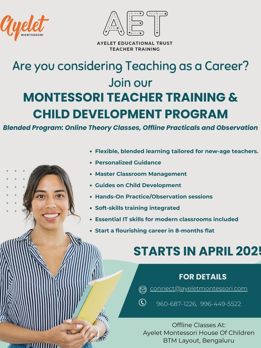 This is for anyone considering a career in teaching, wanting to homeschool effectively, or simply wishing to become a more conscious parent. My 8-month blended program offers a deep dive into authentic Montessori philosophy, with online theory classes for flexibility and in-person practicals at my school in Bengaluru for essential hands-on experience.
