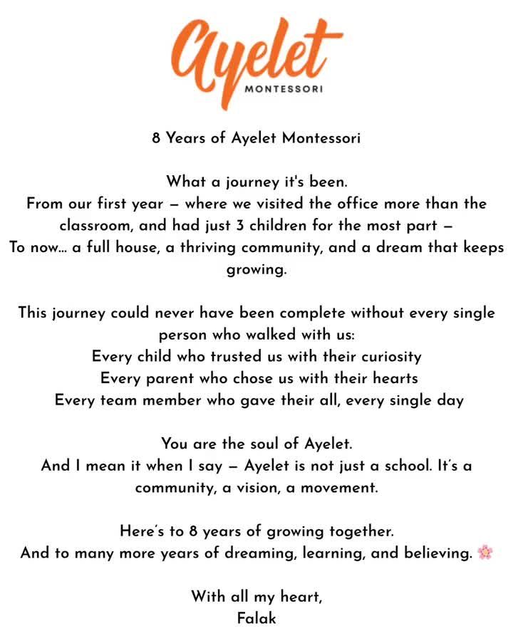 Ayelet is more than just a school; it's a thriving community of children, families, and dedicated guides. We celebrate our journey together, building relationships founded on trust, respect, and a shared passion for growth and learning.