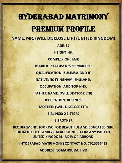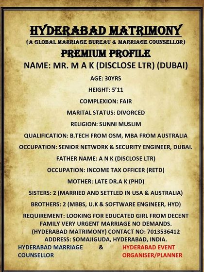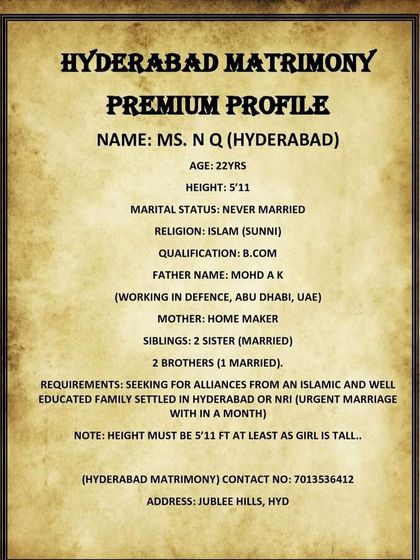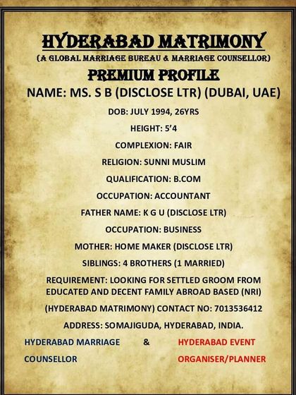 Salaam, I’m Ayesha Namazi, running Hyderabad Matrimony. People say I’m blunt, but I just call it honest. Marriage is half your faith - if your partner’s good, life’s a paradise, hai na? I help Muslims find matches, whether you’re in Hyderabad, Bangalore, ya fir US, UK, Canada. I won’t give fake promises, bas Allah ki marzi and family’s will. I just connect you to genuine, decent profiles - rest is up to you.