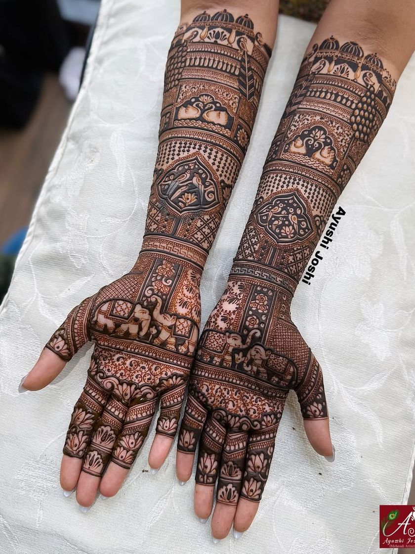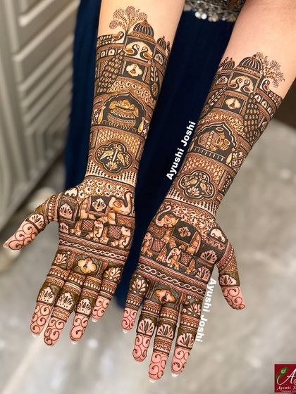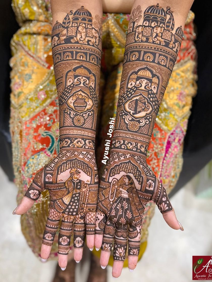 Celebrate timeless traditions with classic bridal mehendi. I create intricate designs featuring royal bride and groom figures, wedding ceremonies like Varmala and Gathbandhan, and auspicious symbols.