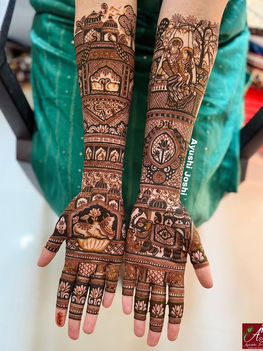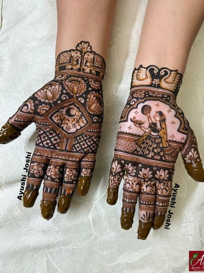 Bring divine stories to life with mehendi that portrays gods and goddesses. I specialize in detailed figures like Radha-Krishna and Mahadev, perfect for adding a spiritual touch to your celebration.