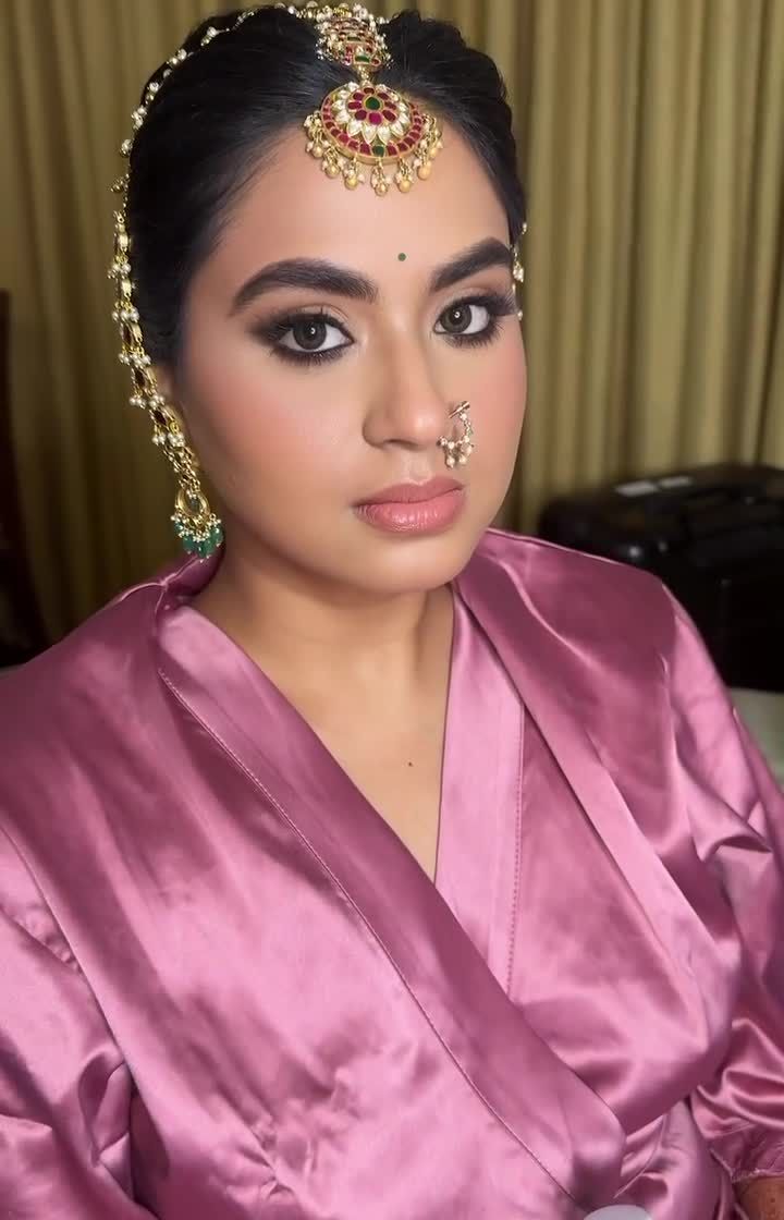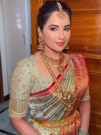 I specialize in creating luminous and elegant looks for South Indian ceremonies. This includes classic makeup for the Muhurtham, Pellikuthuru, and engagement, designed to complement traditional Kanjeevaram sarees and temple jewelry.