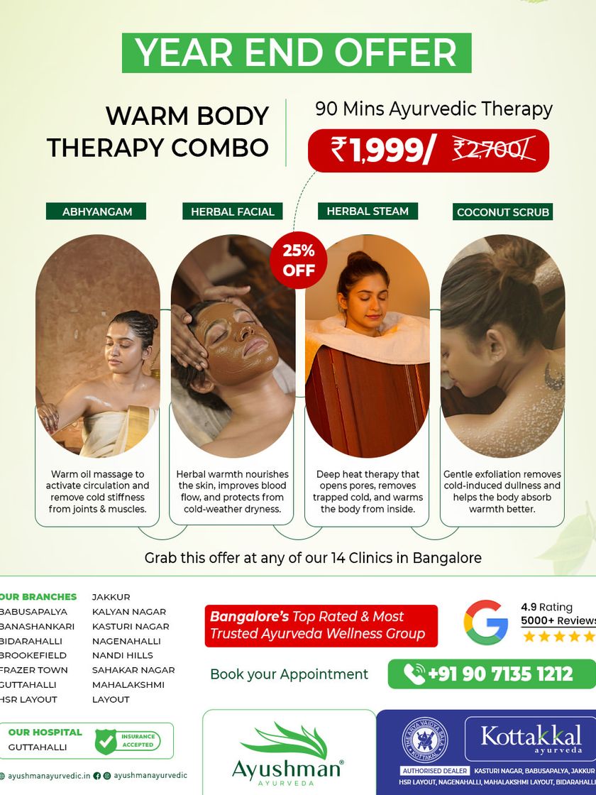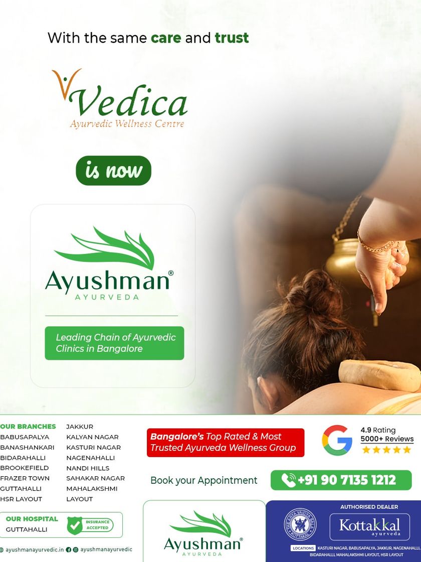 With over 13 clinics across Bangalore and a full-fledged hospital in Guttahalli, authentic Ayurvedic care is always within your reach. We are proud to be Bangalore's most trusted and accessible Ayurveda group.