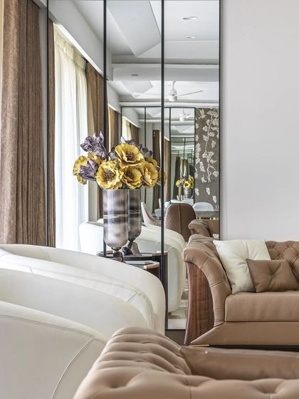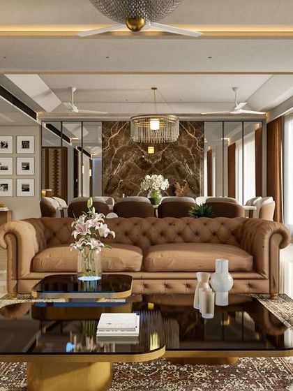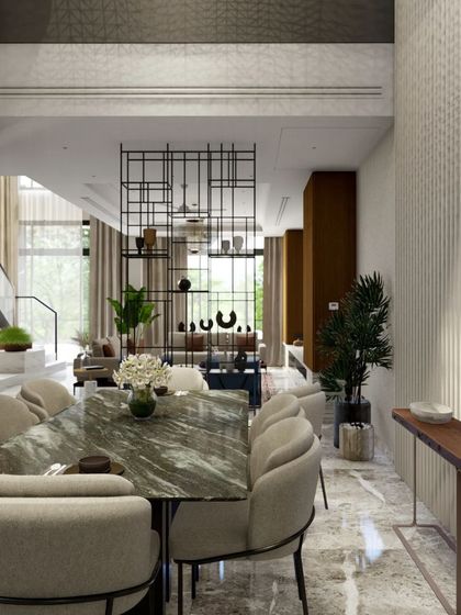 We specialize in creating opulent and sophisticated interiors with a modern aesthetic focus. Our designs feature neutral color palettes with beige and brown accents, unique elements like fluted glass walls, LED highlights, and wood-clad metal staircases. We also offer bespoke furniture solutions through partnerships with premium furniture providers.