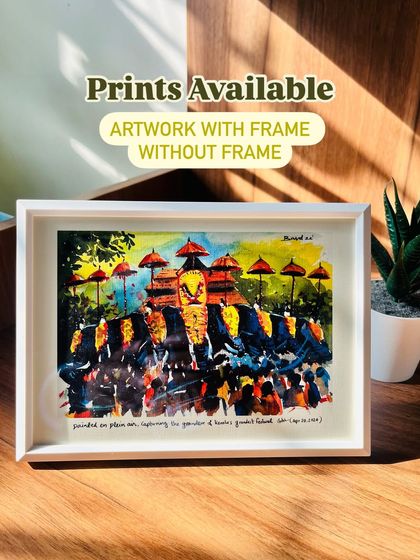 - My Kerala plein air sketches, like the 'Thrissur Pooram' print, try to capture the buzz and warmth of my home. You can get these framed or unframed.