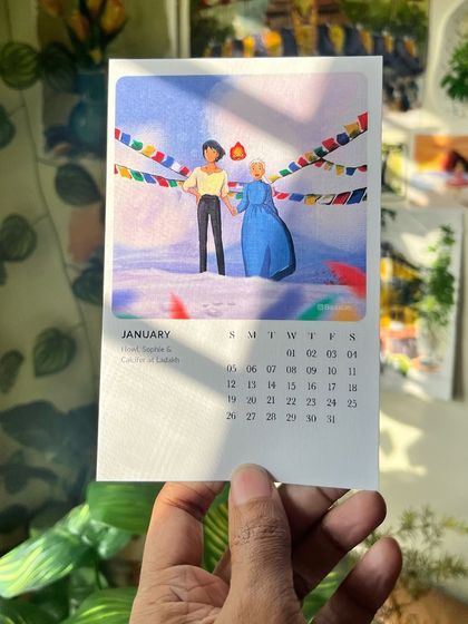 - My "Studio Ghibli: The Indian Chronicles" calendar is close to my heart. Think Howl in Ladakh or Totoro at Christmas in Pondicherry. Each month is a new scene, printed on thick, textured paper, and comes with a wooden easel plus little goodies like bookmarks and stickers. After the month, just snip out the artwork and frame it.