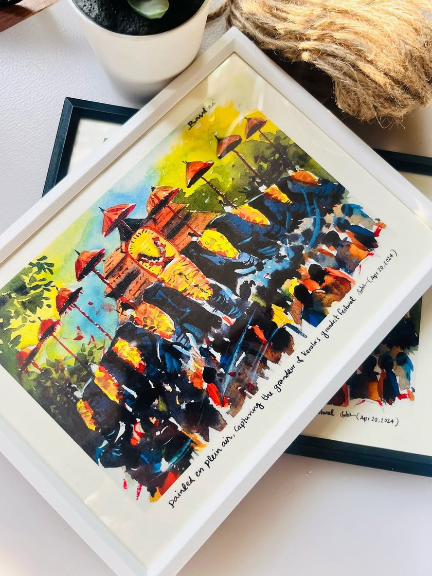 Bring a piece of my world into yours. This collection features high-quality art prints of my original paintings, including the popular 'Thrissur Pooram' series, available framed or unframed. You'll also find my illustrated calendars, bookmarks, and other merchandise, all packed with a personal touch.
