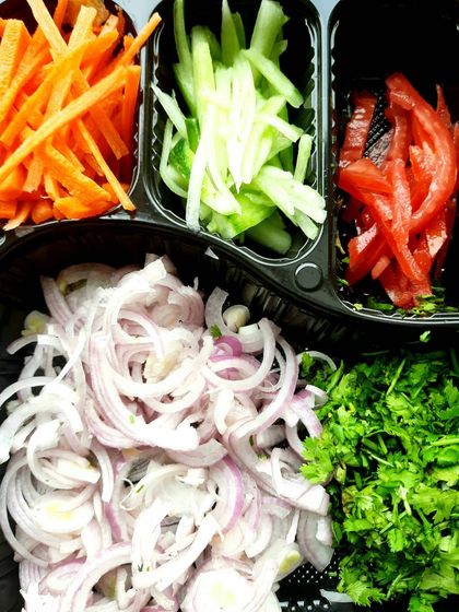 - B’luru Kebab: My version of Bengaluru style chicken kebab - it’s got that classic red look, but the main thing is how tender and flavour-packed it is. Served with onion rings, nothing fancy.