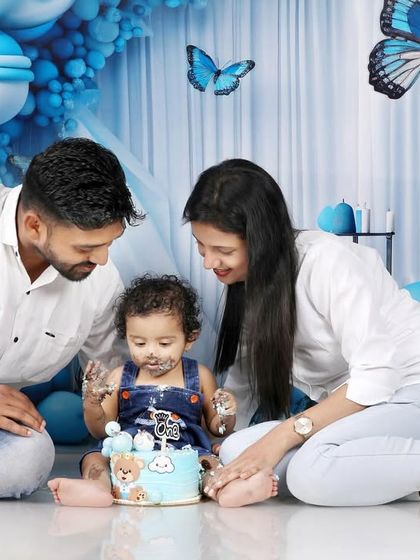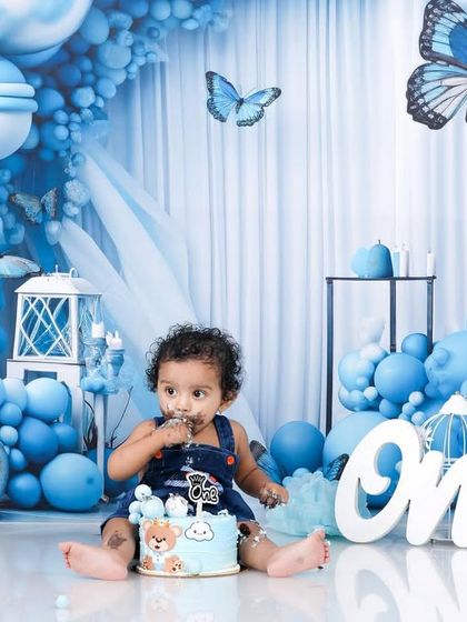 A cake smash is the perfect, messy way to celebrate a first birthday. I provide a fully decorated set, often with a theme like this blue butterfly backdrop, and capture all the fun as your little one dives into their first cake. I also make sure to get family shots during the session.