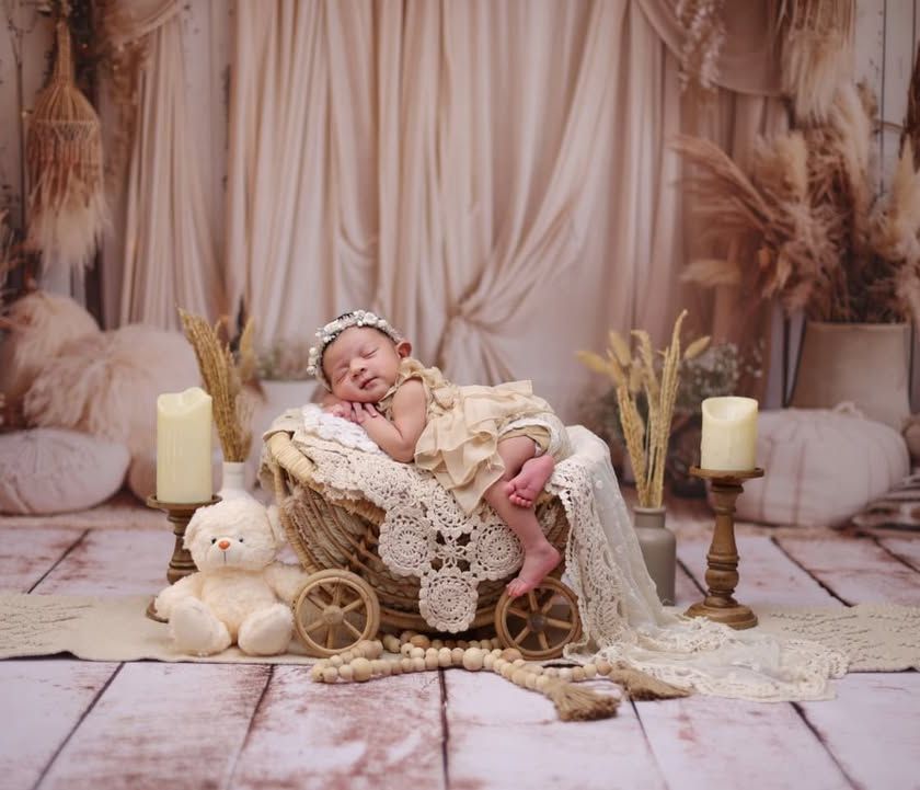 For a natural and earthy aesthetic, our boho and rustic themes are the perfect choice. We use elements like macrame, dried grasses, wood textures, and warm, neutral tones to create timeless and artistic newborn portraits.