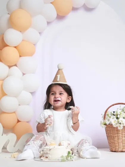 The first birthday is a milestone like no other, and I love celebrating it with you. From classic portraits with 'One' props to the pure, messy joy of a cake smash, we design a session that is all about your little one's personality. I offer a variety of themes and setups in my studio to make their big day unforgettable.
