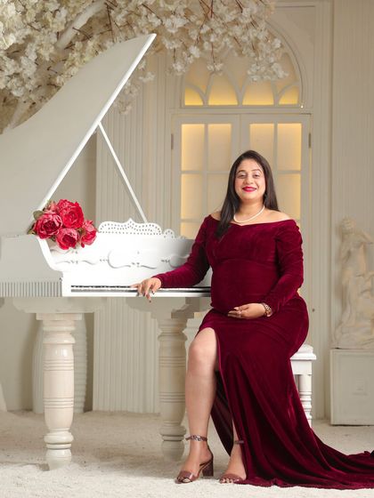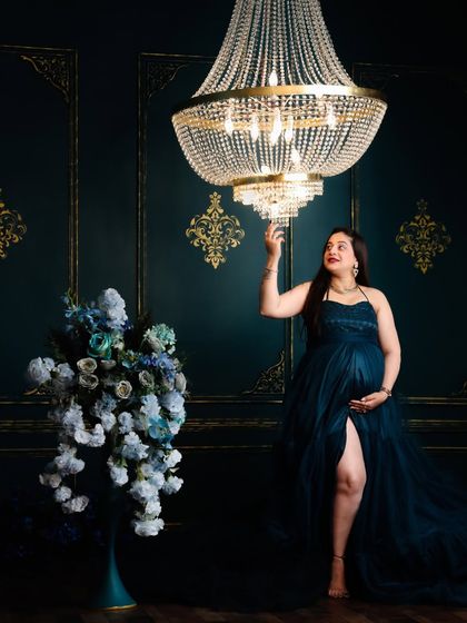 Most sessions happen in my studio, where I can set up anything from chandeliers to floral arrangements. But if you want an outdoor maternity photoshoot, we can head to a park, garden, or even the beach. Nature adds its own magic.