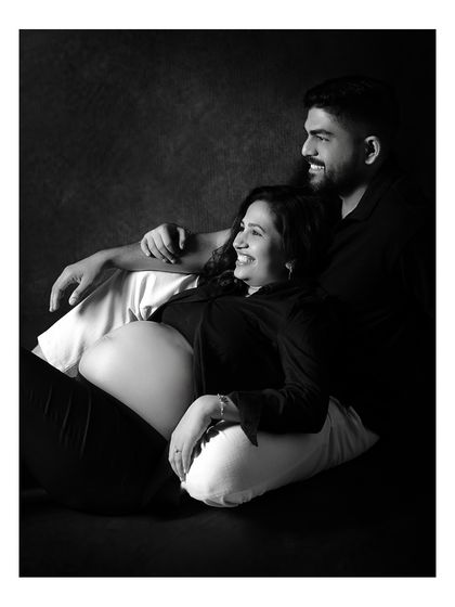 You get to choose how you want your maternity photos to look. Some moms love the classic saree look - ekdum traditional (totally traditional) - while others go for jeans and a casual vibe. I do everything from dreamy boho setups with soft light and flowers, to minimalist studio maternity photography where it's just you and a simple backdrop. If you want something dramatic, we can play with gowns and lighting. Black and white? Always hits different.