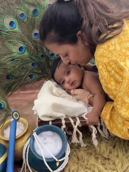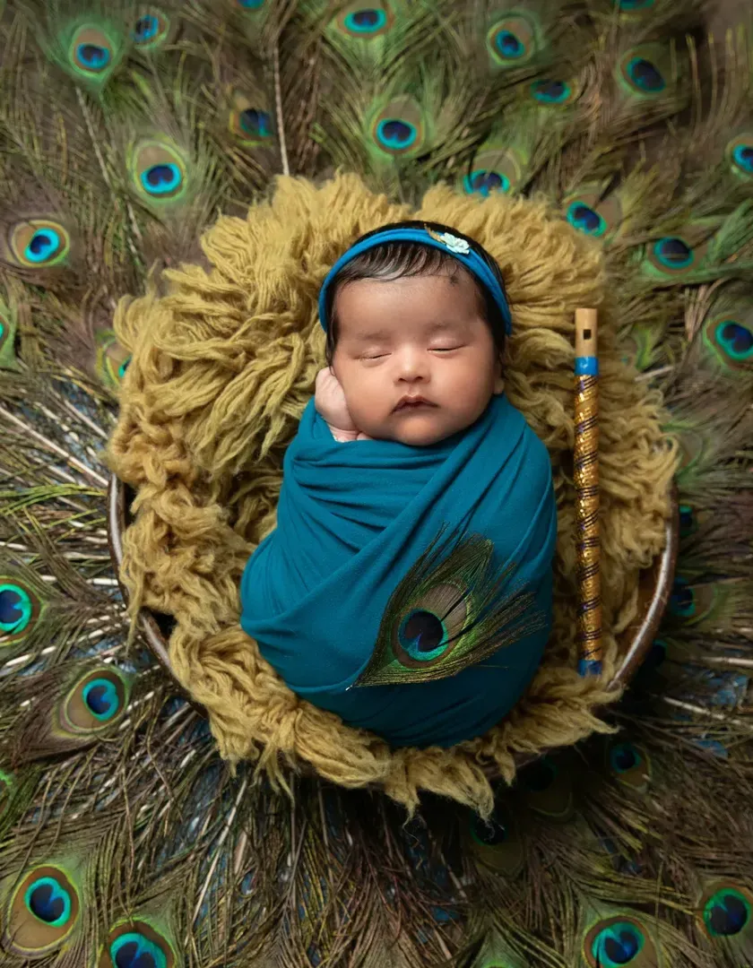 I love bringing cultural stories to life, especially with our popular Janmashtami photoshoots. These sessions feature your baby as a divine little Krishna, complete with peacock feathers, a flute, and a pot of butter. I also create setups for other festivals like Holi, creating vibrant and joyful memories.