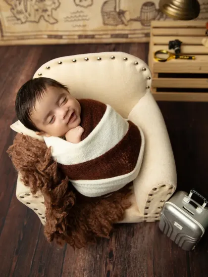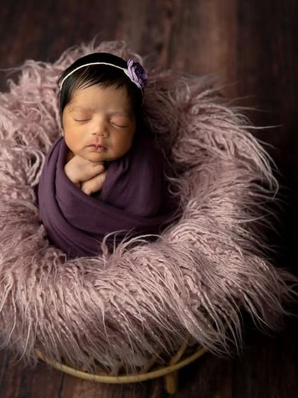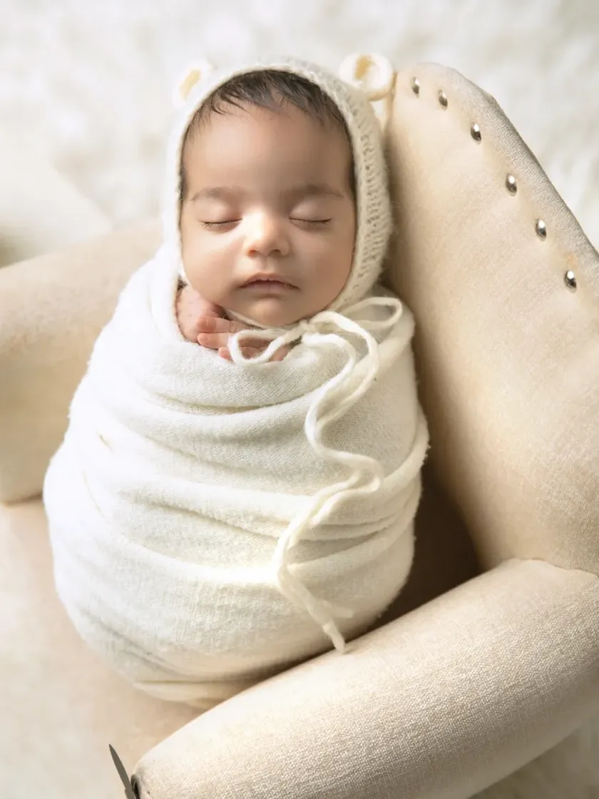 My specialty is creating timeless, posed portraits of your newborn. I use soft wraps, delicate headbands, and cozy props to keep your baby comfortable and sleepy, resulting in those classic, curled-up images you'll adore. This includes a variety of color palettes from pure whites to soft pastels.