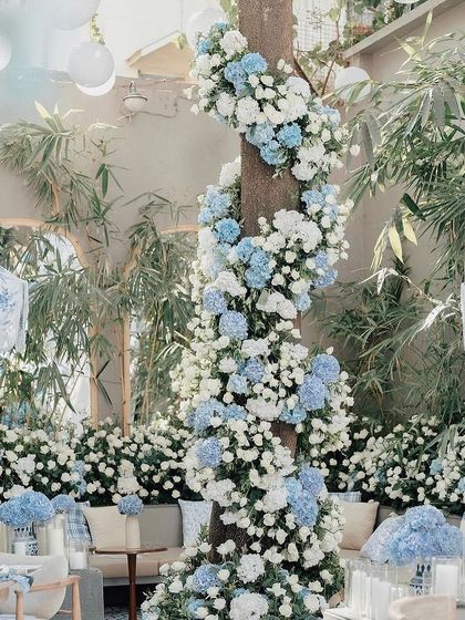 - Exotic Blooms: Dominant use of imported flowers (Hydrangeas, Tulips, Peonies, Anthuriums) for wall cladding and cascading ceiling installations.