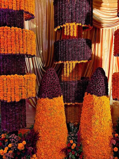 - Ceiling Work: Partial ceiling masking with fabric scallops and hanging floral strings (tuberoses/wisteria) or chandelier clusters.