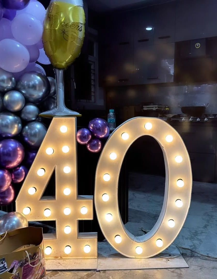 Party ko aur special banane ke liye main light-up marquee numbers aur custom neon signs rent par deta hoon. "Happy Birthday", "Oh Baby", naam ya age, aap kuch bhi banwa sakte hain.