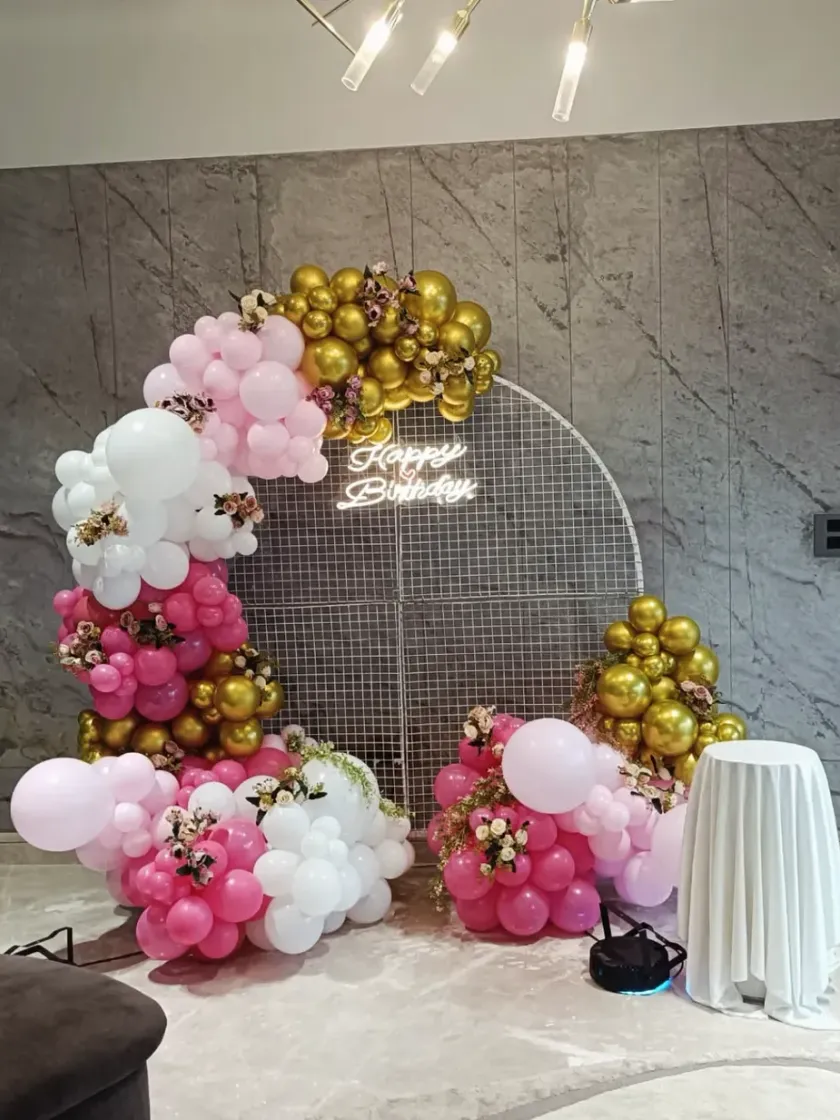 For a clean and modern look, I offer simple yet beautiful decoration services. This includes setups with arched backdrops, pastel balloon garlands, and delicate floral arrangements. These designs are perfect for any age and can be customized to fit your home or a banquet hall.