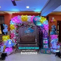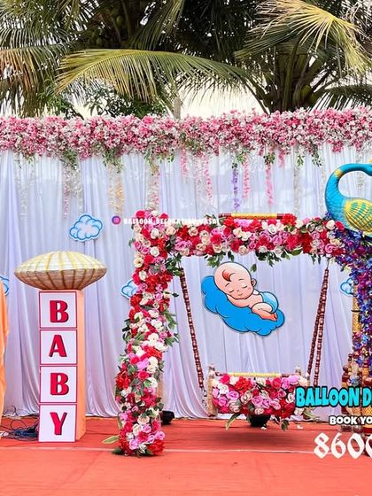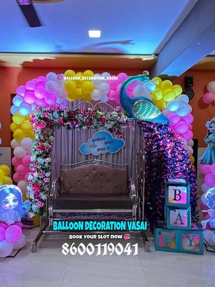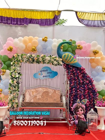 The peacock theme is a popular and stunning choice for both baby showers and naming ceremonies. I specialize in creating these grand designs, featuring intricate peacock figures made of sequins or balloons and beautifully decorated jhulas (cradles).