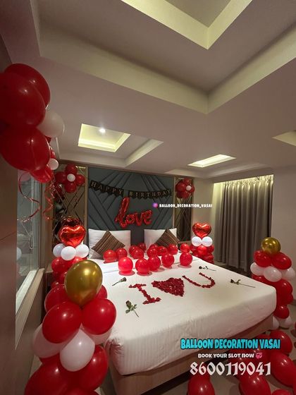 Surprise your loved one with a romantic room decoration for their birthday or anniversary. We can transform any room with ceiling balloons, foil banners, heart-shaped balloons, and beautiful rose petal arrangements on the bed.