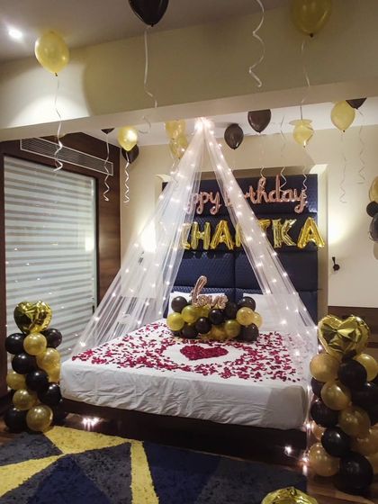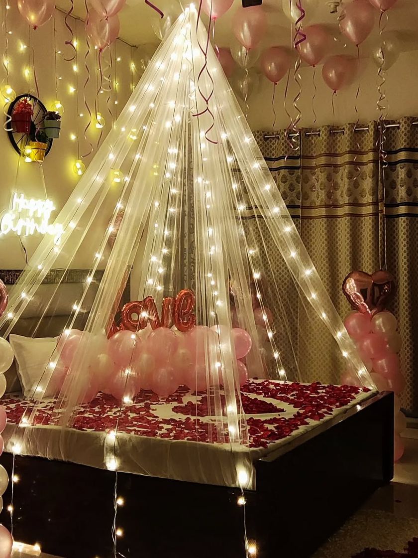 I transform standard bedrooms into intimate, celebratory spaces for birthdays and romantic surprises. Setups often include light-up canopies over the bed, custom balloon arrangements, and rose petal decorations.