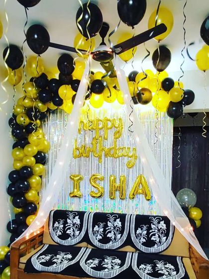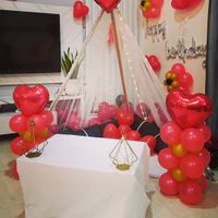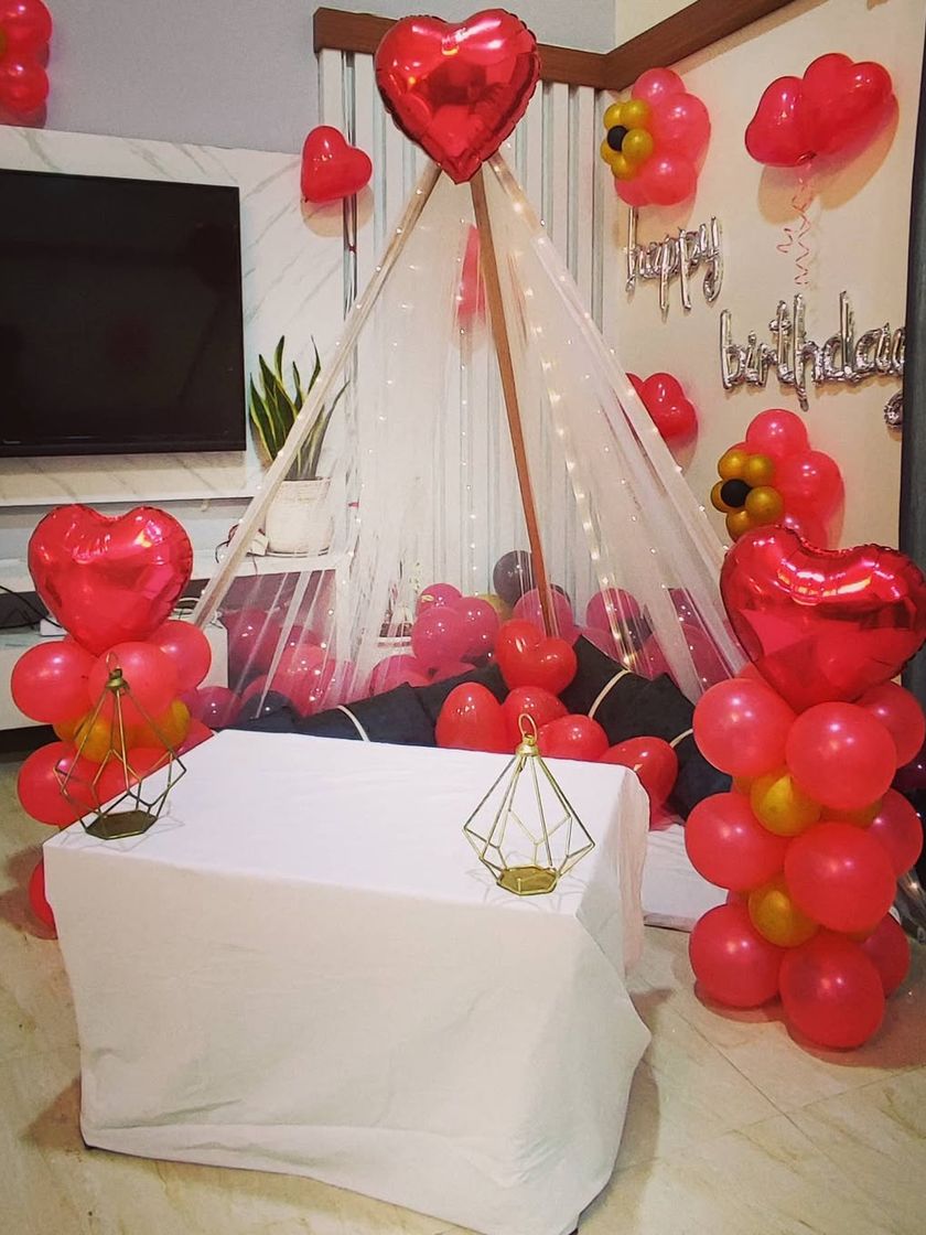 I also create surprise decorations in living rooms and other common areas. These setups can range from canopy arrangements over a sofa to elaborate balloon displays with decorated tables.