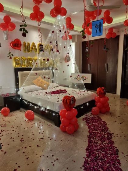 - This one's our top hit. We do full romantic room setup with balloons and sheer fabric canopies, fairy lights, rose petals, and even photos hanging from the ceiling balloons.