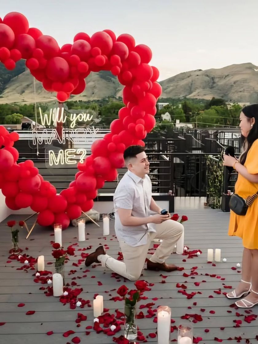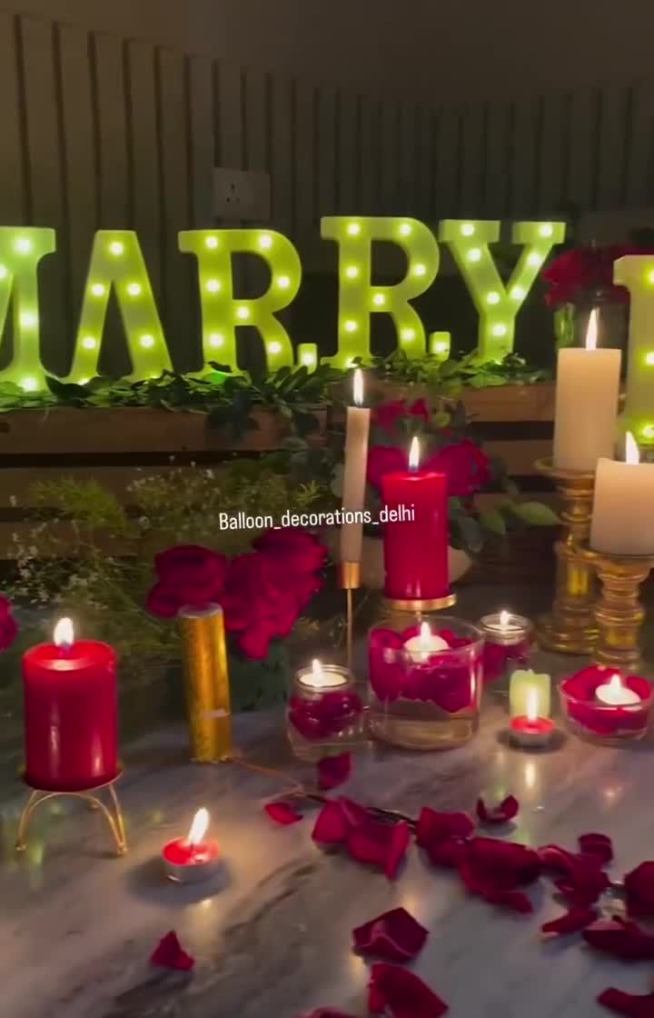 We create the perfect "Will you marry me?" moment. Our setups range from grand outdoor displays with large balloon hearts and neon signs to intimate indoor arrangements with "MARRY ME" marquee letters, candles, and personalized messages.