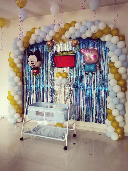 I specialize in decorations for the Namkaran Sohala, with a focus on beautifully decorated cradles, or 'palna', using fresh flowers or theme elements. I also provide custom signs like 'माझे नाव' for the special name reveal moment.