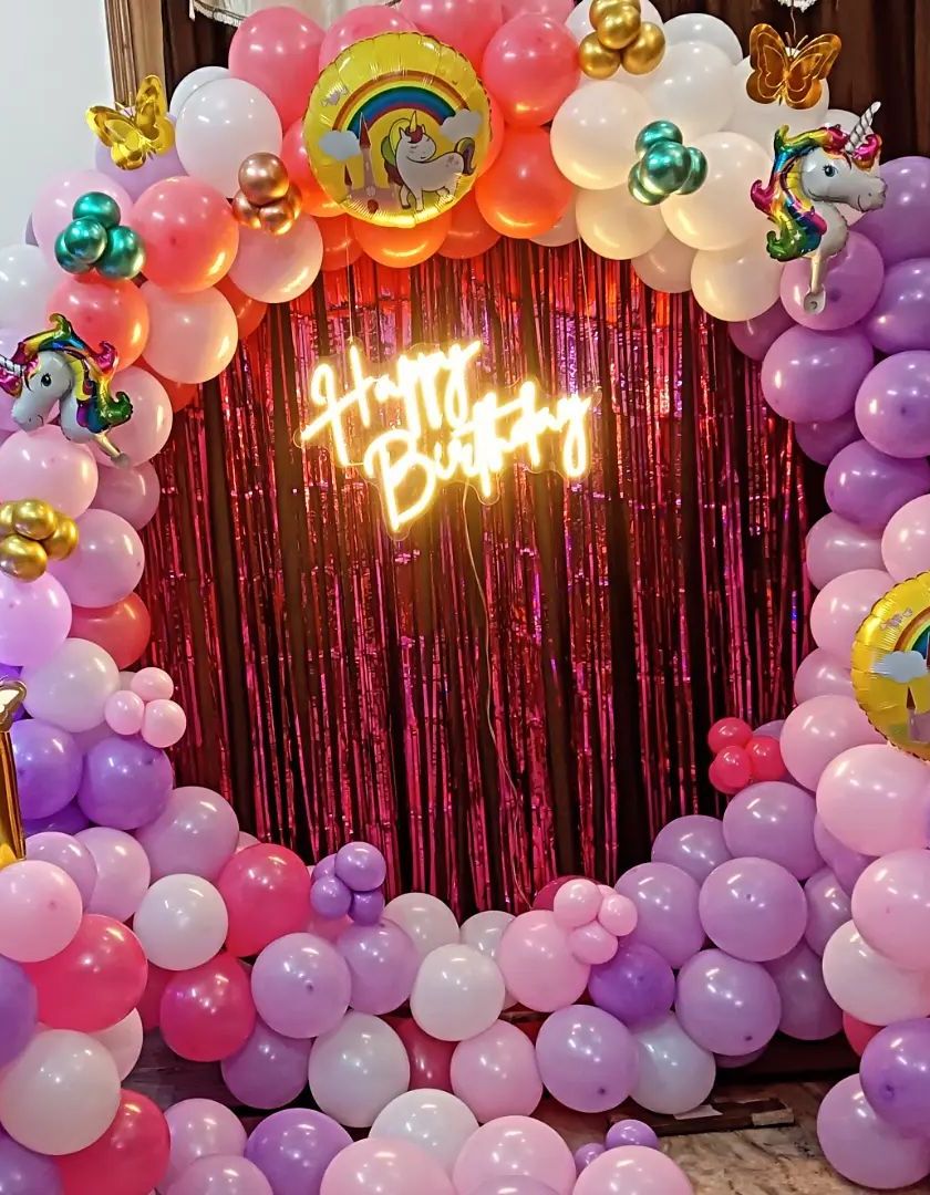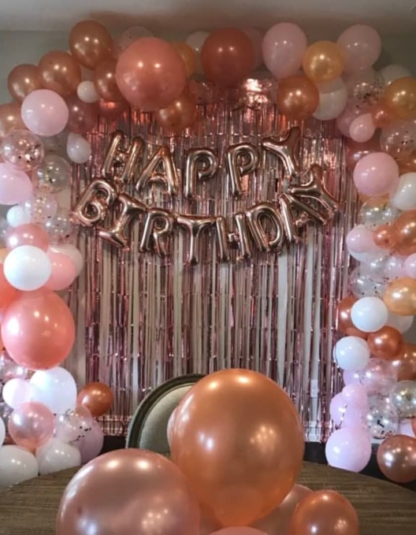 For a sophisticated look, I specialize in trendy color combinations like rose gold, silver, and classic gold and white. These setups feature metallic and chrome balloons, shimmering fringe backdrops, and optional neon signs for a modern touch.