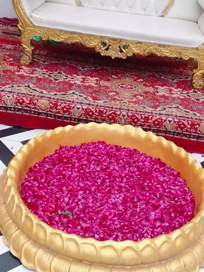 - Floor: Basic rug with a brass Urli bowl containing loose petals.