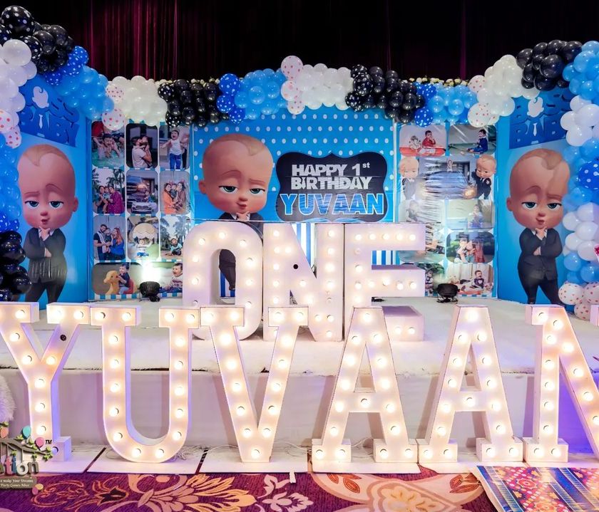 This is one of my most requested themes, and I love doing it. I can handle everything from a full banquet hall transformation to a fun setup in your home. I create custom stages with the baby's name, balloon arches, character cutouts, and photo backdrops to make your little boss's day perfect.