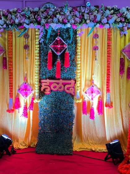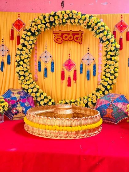 I make your Haldi ceremony pop with colour and tradition. I use lots of genda phool (marigolds), bright yellow drapes, and fun props. I can create anything from a simple marigold backdrop at home to a large, themed setup with custom 'हळद' signs and artificial green walls.