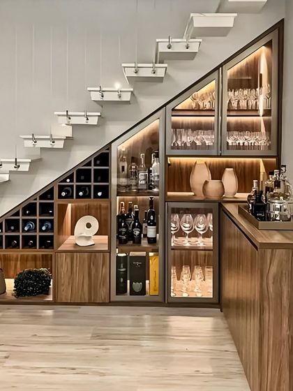 - Modern bar cabinet designs to show off your glassware, with built-in wine racks and display lighting, even in tricky spaces like under the stairs.
