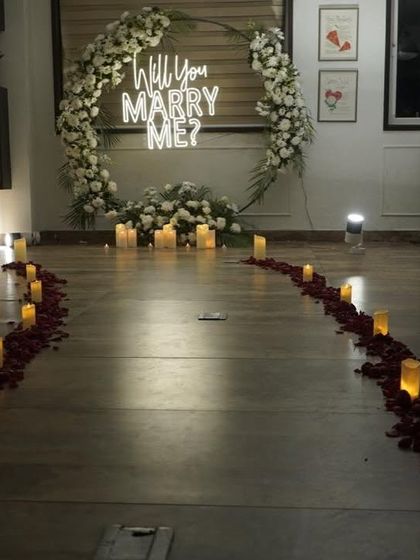 - Romantic proposal decor Bangalore - heart arches, neon "Marry Me" signs, rose petals, and candles. I love making this one extra special.
