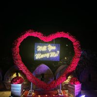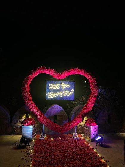 I create unforgettable proposal moments, from grand outdoor declarations to intimate indoor surprises. These setups feature elements like custom neon "Marry Me" signs, dramatic heart-shaped arches made of roses, and romantic pathways lined with candles and petals.