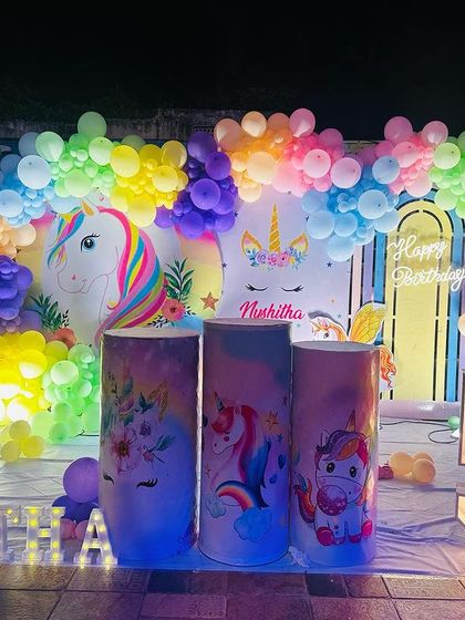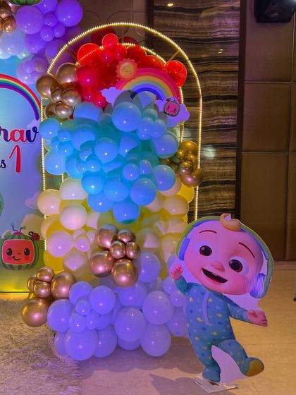 We set up custom birthday party decorations with balloons, flowers, props, and backdrops for any theme and age, at your chosen location in Bangalore.