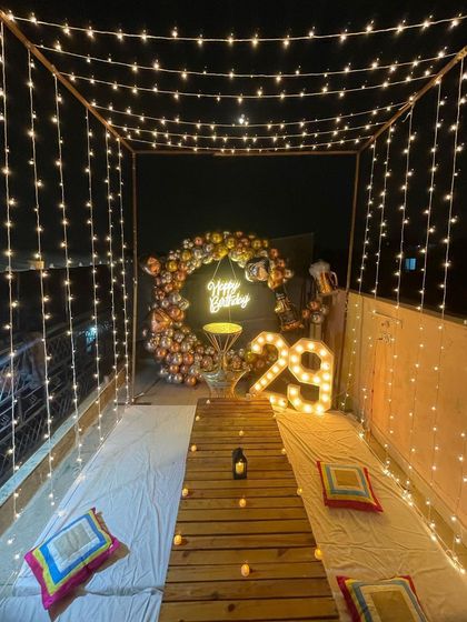 I can turn any outdoor space, balcony, or terrace into the perfect party venue. I use elements like canopies of fairy lights, elegant low seating arrangements, and beautiful balloon backdrops to create a magical atmosphere for evening celebrations.