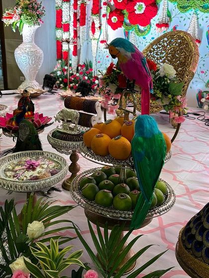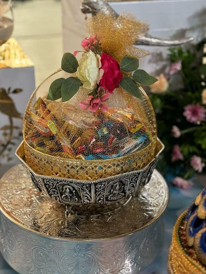We specialize in creating stunning plate decorations for traditional Indian ceremonies and events. Our designs feature intricate arrangements of fruits, sweets, and floral elements, enhanced with traditional motifs like peacocks and elephants. We use high-quality silver and gold containers, incorporating personalized elements like engraved names or initials.