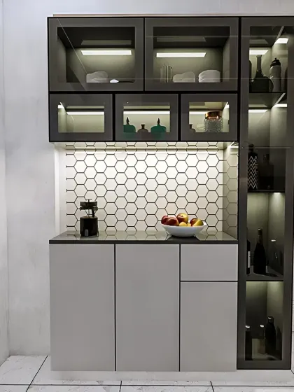 - Crockery and bar cabinets with options like glass fronts, wine racks, and mirrored backsplashes.