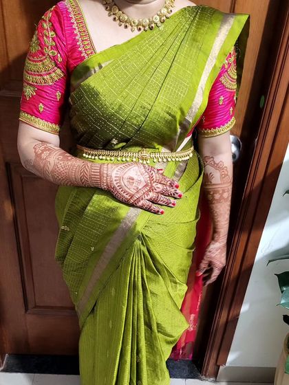 Hey, I'm Nimmi, the Saree Drapist. Saree draping isn't just a job for me - it's pure joy. I love getting every pleat just right, whether it's for a bride, a biker in Banarasi, or a mom-to-be at her Bheegara Oota (post-wedding feast). Teaching is close to my heart too. Seeing someone nail Madisar saree draping after my workshop, that's a proud moment. I just want every woman to feel beautiful and rooted.