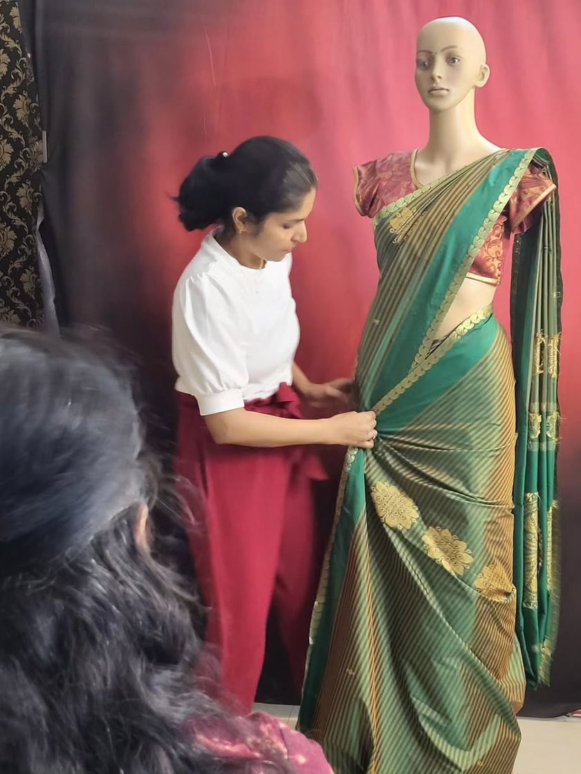 Draping for deities is a sacred art that I approach with immense care and devotion. I offer specialized draping services for festivals like Varamahalakshmi, creating beautiful and intricate styles for the Goddess idol. You can also enroll in a workshop to learn this unique skill yourself.