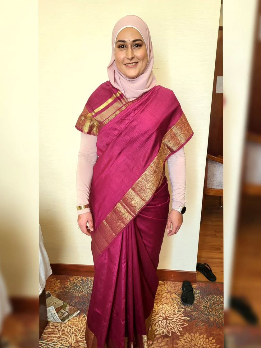 I believe every woman should be able to wear a saree beautifully. I offer draping services that respectfully and elegantly incorporate the hijab, ensuring a complete and graceful look.