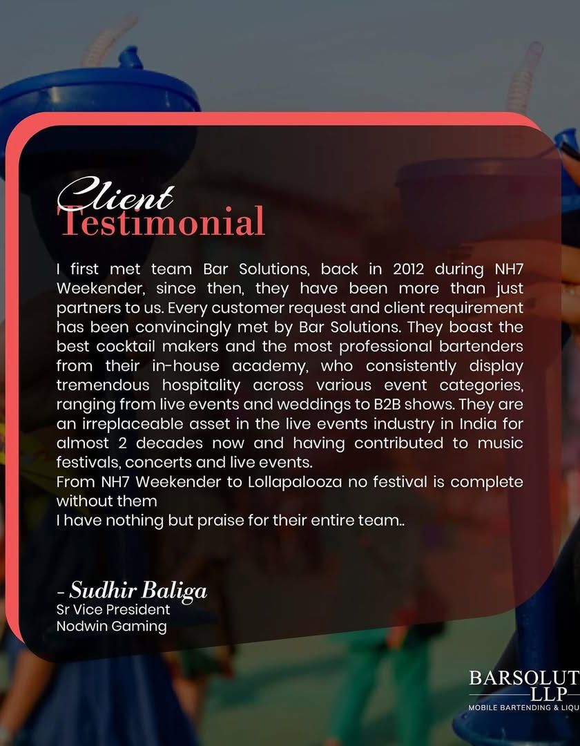 We are proud of the long-standing relationships we have built with our clients over nearly two decades. Their trust is a testament to our commitment to delivering flawless bar management and exceptional hospitality for events of all scales.