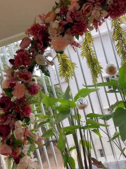 - Floral Installation: One large asymmetrical floral arch (L-shaped or Semi-circle). Composition includes a blend of fresh flowers (Roses, Carnations) and high-quality silk florals.