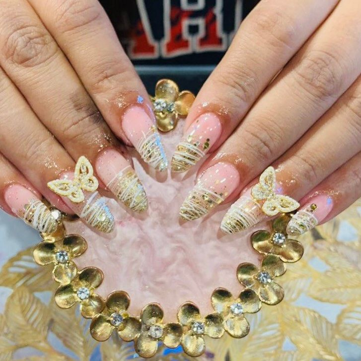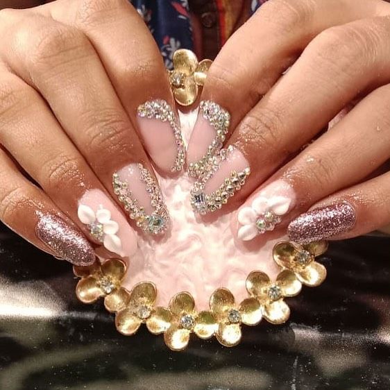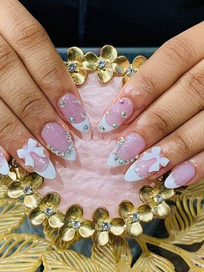 I love adding dimension to my nail sets with hand-sculpted acrylic flowers, bows, butterflies, and carefully placed rhinestones. These designs range from a single statement nail with a 3D charm to a full set covered in sparkling crystals for a truly luxurious look.